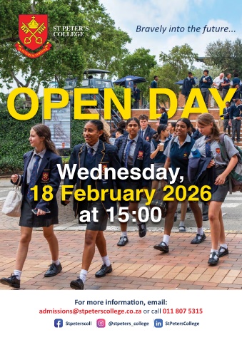 Bravely into the future... Y OPEN DAY OPEN DA Wednesday, 18 February 2026 at 15:00 For more information, email: admissions@stpeterscollege.co.za or call 011 807 5315 Stpeterscoll @stpeters_college StPetersCollege