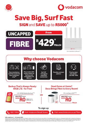 400GB; 30Mbps: Hard lock FUP – 600GB; 50Mbps: Hard lock FUP – 1TB; 100Mbps: Hard lock FUP – 2TB. Each plan has an applicable up to speed. Speeds are not guaranteed by Vodacom. *5G coverage only available AX3000 x2 and self-installation applies. Promotional offer is valid for any existing Vodacom mobile contract customer that signs up for a new 24-month Fibre contract with a minimum line speed of 50 Mbps. Applicable on