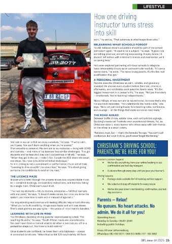 THE ROAD TO CONFIDENCE first rule in my car is that we enjoy ourselves,” he says. “If we’re calm, CHRISTIAAN’S DRIVING SCHOOL: