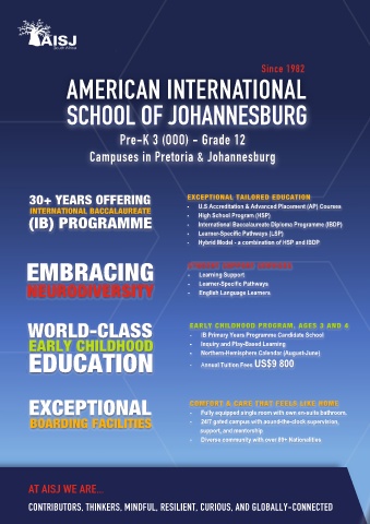 CONTRIBUTORS, THINKERS, MINDFUL, RESILIENT, CURIOUS, AND GLOBALLY-CONNECTED admissions@aisj-jhb.com | www.aisj-jhb.com