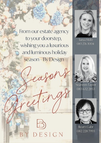 From our estate agency to your doorstep, Tanya Mohr wishing you a luxurious 083 276 3004 and luminous holiday season - By Design Seasons Seaneen Taylor Greetings 083 632 2853 Ikram Gabr 082 228 7993
