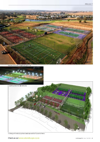 PROJECT Overview of the new racquet and sports club Lighting allows for night time play 3-D design of the facility by Novo Landscape and Golf Course Architects Check us out www.salandscape.co.za Landscape SA • Issue 156 2025 21