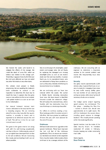 We treated the water with bacteria to We are continuing to fix streetlights, water clubhouse. We are consulting with an